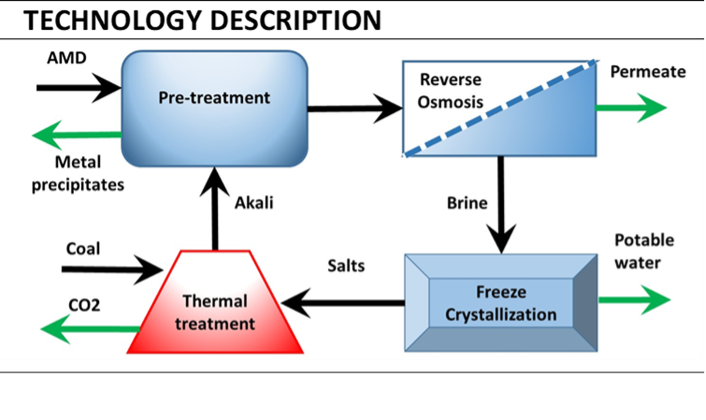 ROC Water Technologies focus on the treatment of saline waters with the aim to recover drinking water and saleable products using a four-stage process (neutralization, desalination with reverse osmosis, brine treatment with freeze crystallization and product recovery with thermal treatment. Valuable products to recover include: (i) pigment from ferric hydroxide in the neutralization stage, (ii) drinking water from the desalination stage (iii) sodium sulphate from the freeze crystallization stage and (iv) sodium carbonate from sodium sulphate in the thermal stage. This technology aims to: (i) achieve zero waste through product recovery and (ii) income to exceeds the cost.